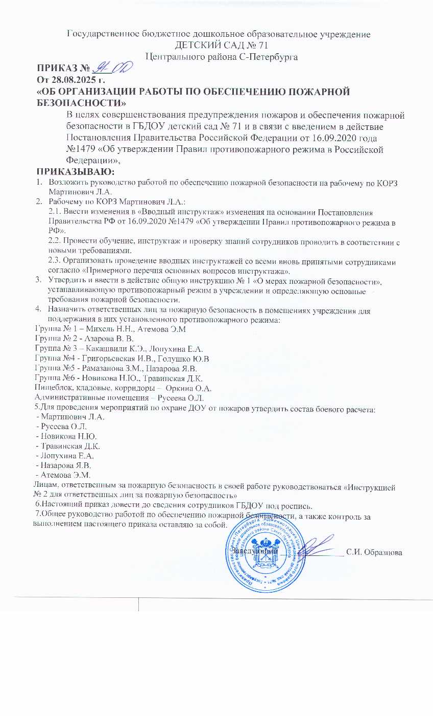 - Локальные акы организации работы по обеспечению пожарной безопасности и противопожарного режима в ГБДОУ детском саду № 71 в 2024 - 2025 учебном году.